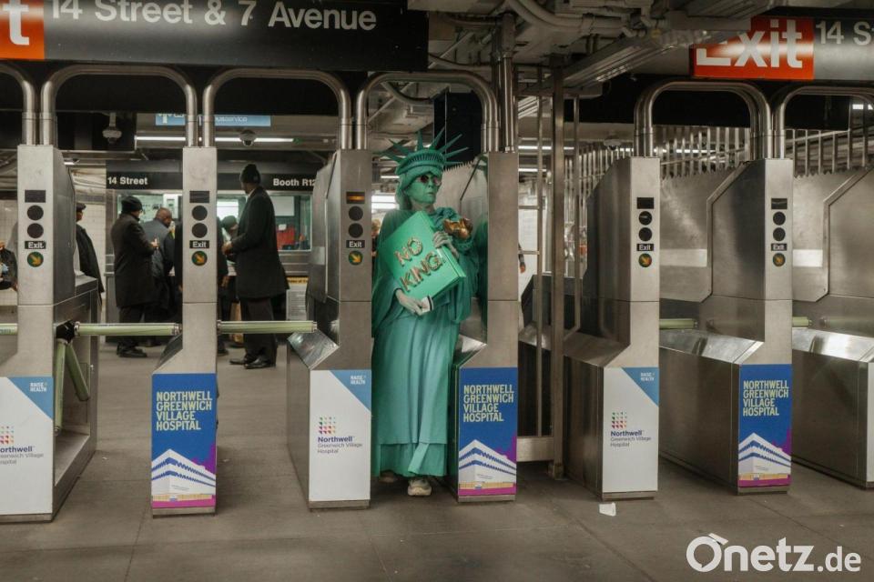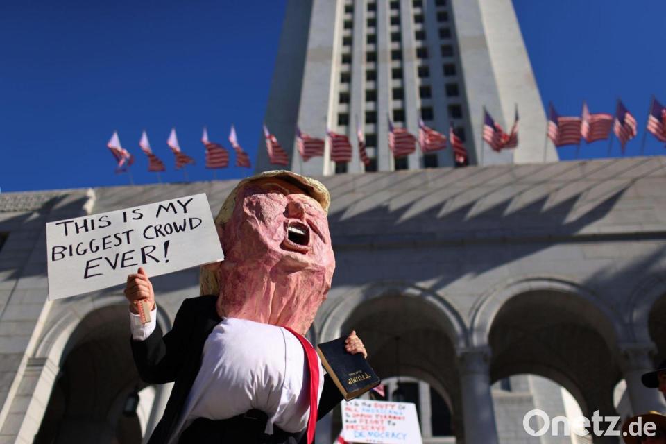 Ein Demonstrant im Donald-Trump-Kostüm nimmt an einer „No Kings“-Demonstration teil.