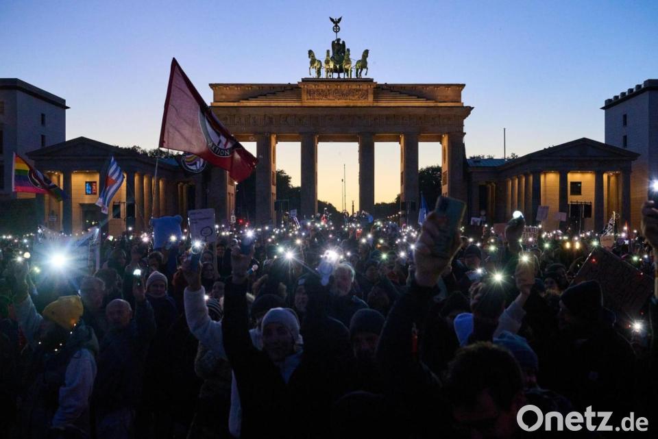 Demonstranten halten ihre Handys mit Taschenlampen vor dem Brandenburger Tor in die Luft. Die Demonstration unter dem Motto „Brandmauer hoch! Wir sind das Stadtbild“ bezieht sich auf eine Äußerung von Bundeskanzler Merz im Zusammenhang mit der Migrationspolitik.