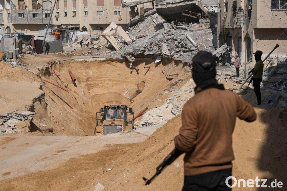 Mitglieder der militanten Hamas-Gruppe graben nach den Leichen israelischer Geiseln inmitten zerstörter Gebäude im südlichen Gazastreifen.