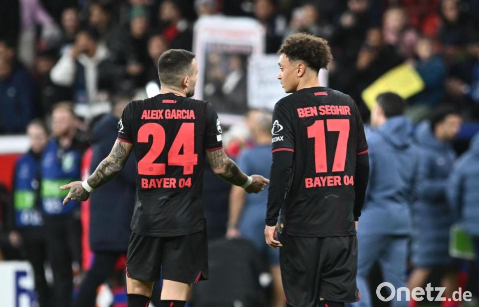 Leverkusens Aleix Garcia (l) und Leverkusens Eliesse Ben Seghir reagieren nach dem Spiel gegen Paris Saint-Germain.