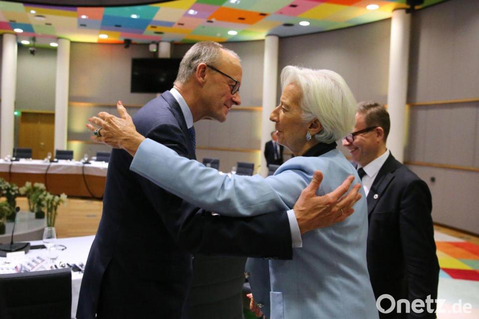 Bundeskanzler Friedrich Merz (l) umarmt Christine Lagarde, Präsidentin der Europäischen Zentralbank, während eines Essens im Rahmen des Euro-Gipfels.