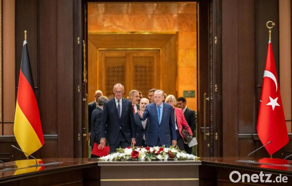 Bundeskanzler Friedrich Merz kommt neben Recep Tayyip Erdoğan, Präsident der Türkei, zu einem Gespräch im Präsidentenpalast.