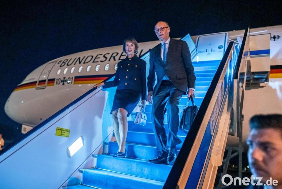 Bundeskanzler Friedrich Merz steigt neben seiner Frau Charlotte am Flughafen in Ankara aus einem Flugzeug der Flugbereitschaft.