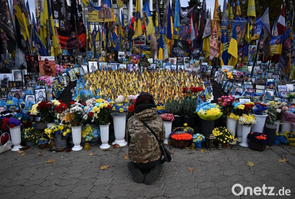 Eine junge Frau kniet am Unabhängigkeitsplatz Maidan in Kiew. Hier wird den Gefallenen des Krieges gedacht.