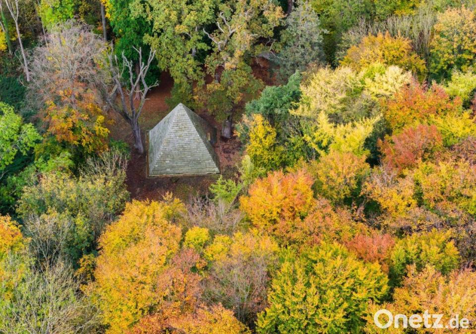 Das Mausoleum des Grafen Ernst zu Münster steht zwischen herbstlichen Bäumen am Laves-Kulturpfad im Landkreis Hildesheim.