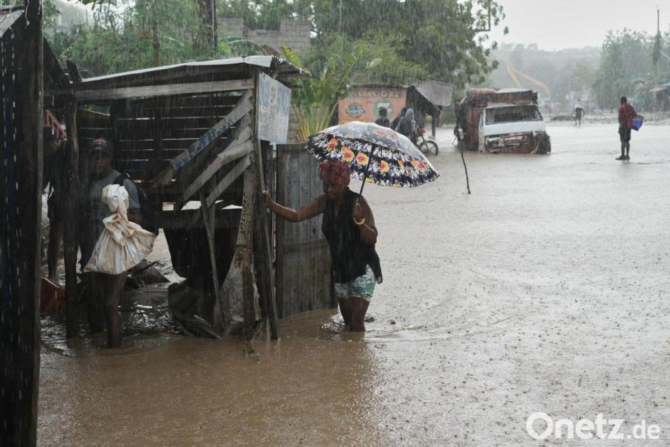 Anwohner waten durch eine überflutete Straße nach dem durchzug von Hurrikan Melissa in Petit-Goave.