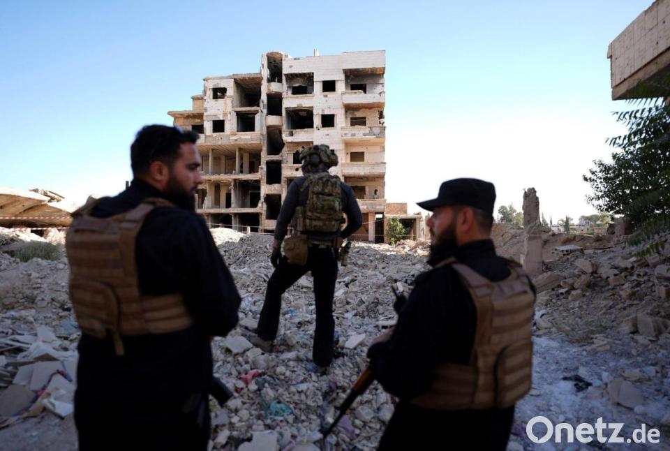 Sicherheitskräfte aus Syrien und aus Deutschland sichern den Besuch von Außenminister Wadephul bei einem humanitären Projekt in einer Straße mit während des Bürgerkriegs zerbombten Häusern in Harasta ab.