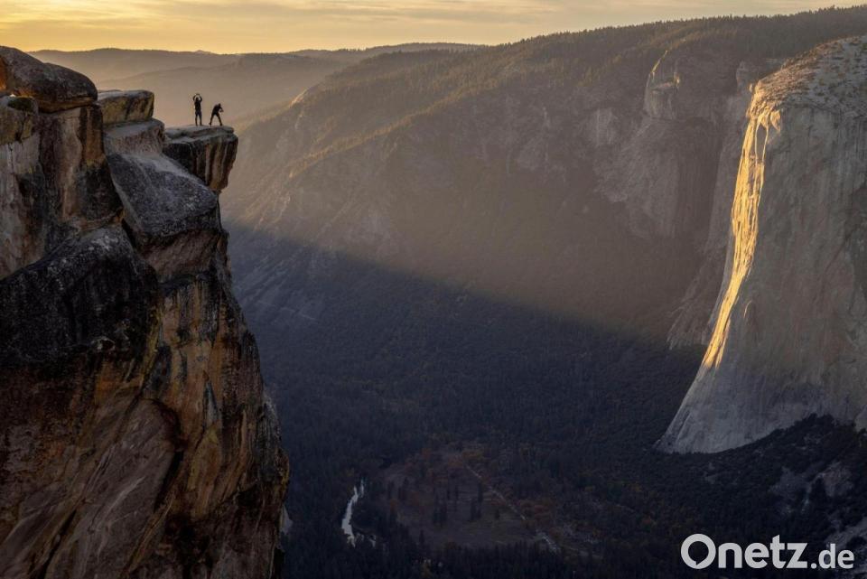 Besucher posieren für ein Foto auf einem Felsvorsprung in der Nähe von Taft Point im Yosemite Nationalpark in den USA.