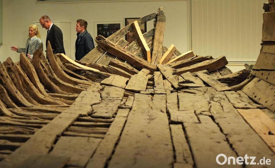 Bundeskanzler Friedrich Merz (2.v.l, CDU) geht mit Museumsdirektorin Astrid Cohrs-Dreessen (l) nach einer Pressekonferenz im Schifffahrtsmuseum Nordfriesland an dem „Zuckerschiff“ vorbei.