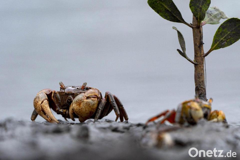 Eine Winkerkrabbe sind in dem Guapimirim-Mangrovengebiet in der Guanabara-Bucht unterwegs.