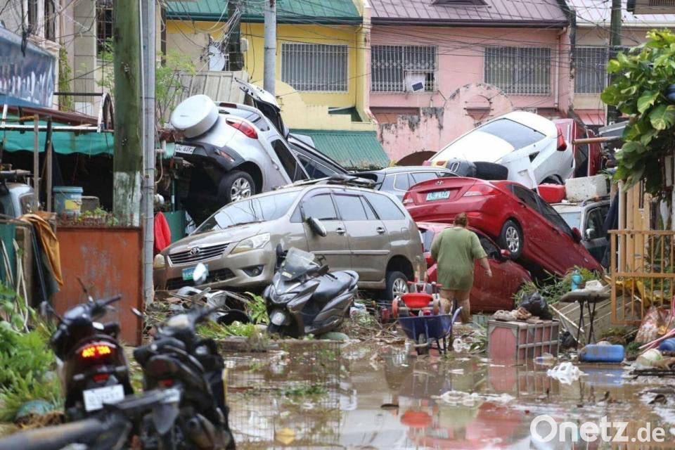 Nach Überschwemmungen durch den Taifun „Kalmaegi“ auf den Philippinen türmen sich Autos.