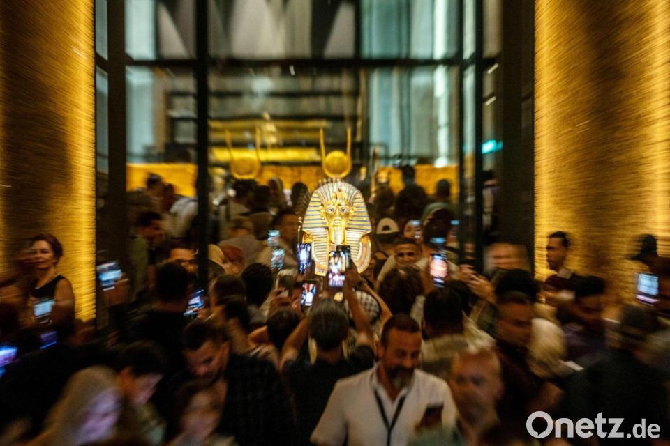 Neu eröffnetes Großes Ägyptisches Museum in Gizeh: Menschenmassen vor der goldenen Totenmaske von Tutanchamun.