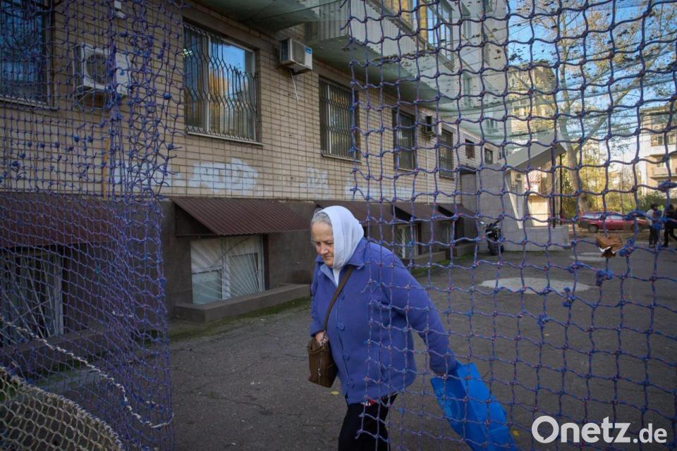 Eine Anwohnerin geht durch einem mit einem Anti-FPV-Drohnennetz bedeckten Hof in der Frontstadt Cherson in der Südukraine.