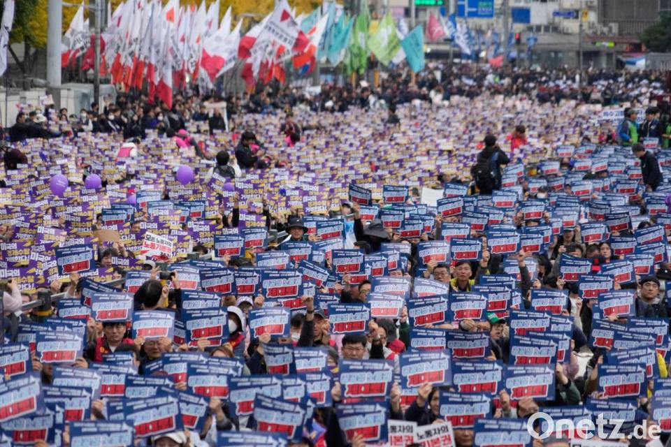 Mitglieder des koreanischen Gewerkschaftsbundes veranstalten in Seoul eine Kundgebung gegen die Arbeitspolitik der Regierung und die Zollpolitik von US-Präsident Trump gegenüber Südkorea.