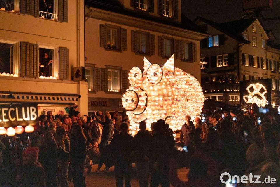 Verschiedenen Objekte aus ausgehöhlten Rüben mit Kerzen, werden bei dem traditionellen Raebechilbi-Umzug durch Richterswil gezeigt.