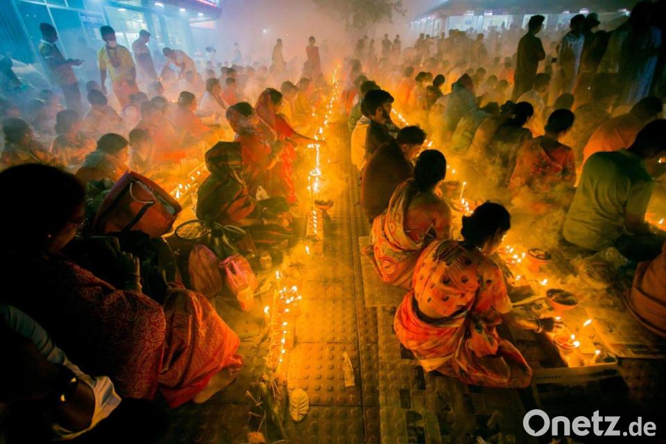 Bangladeschische Hindu-Anhänger sitzen bei Kerzenlicht und beten zu Gott im Shri Shri Lokanath Brahmachari Ashram Tempel in Narayanganj während des religiösen Festes Kartik Brati.