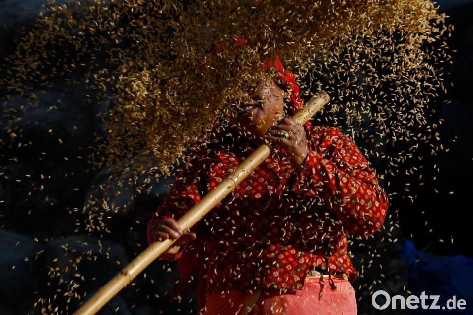 Ein nepalesischer Bauer sortiert die Reiskörner während der Erntezeit am Rande von Bhaktapur, Nepal.