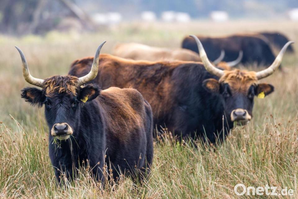 Auerochsen grasen an einem trüben Tag auf einer Wiese im Aueroxenreservat Spreeaue nördlich der Stadt Cottbus.