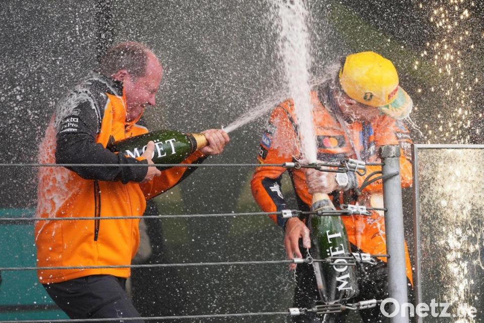 Motorsport: Formel-1-Weltmeisterschaft, Grand Prix von Brasilien, Rennen. McLaren Rennleiter Mark Norris, links, versprüht Champagner für den britischen McLaren-Piloten Lando Norris auf dem Podium.
