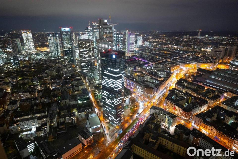 Die Lichter der Straßen und Büros erleuchten die Innenstadt von Frankfurt am Main.