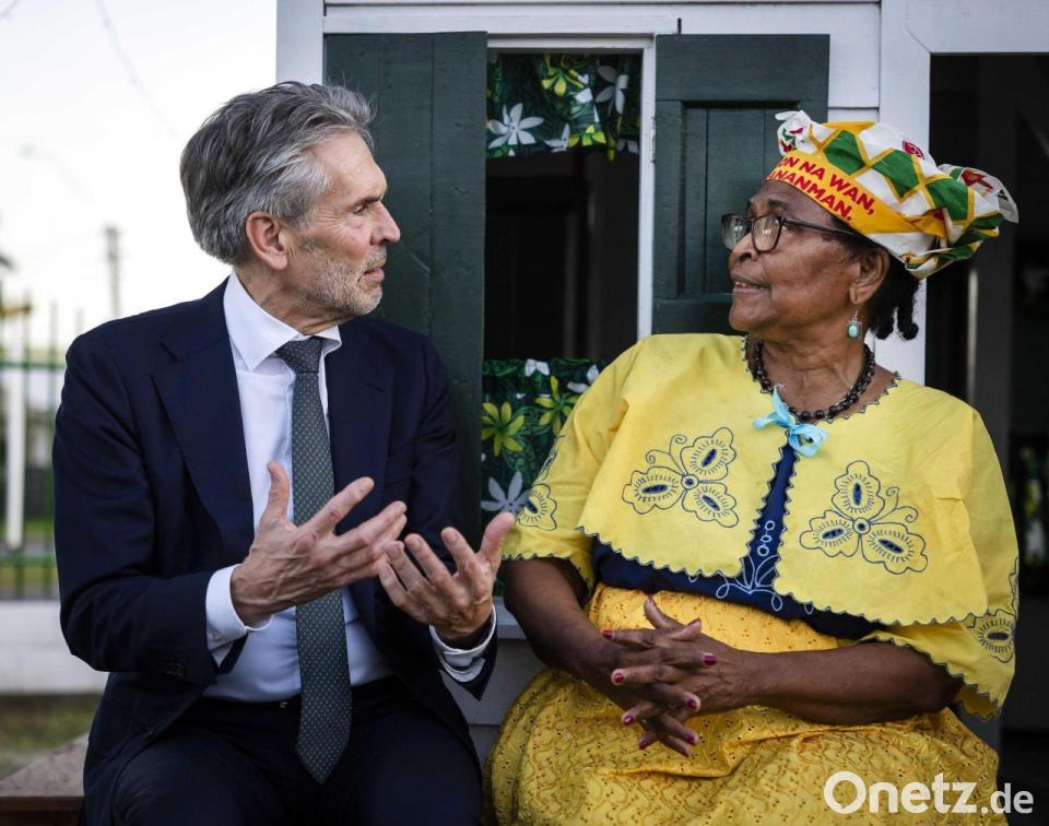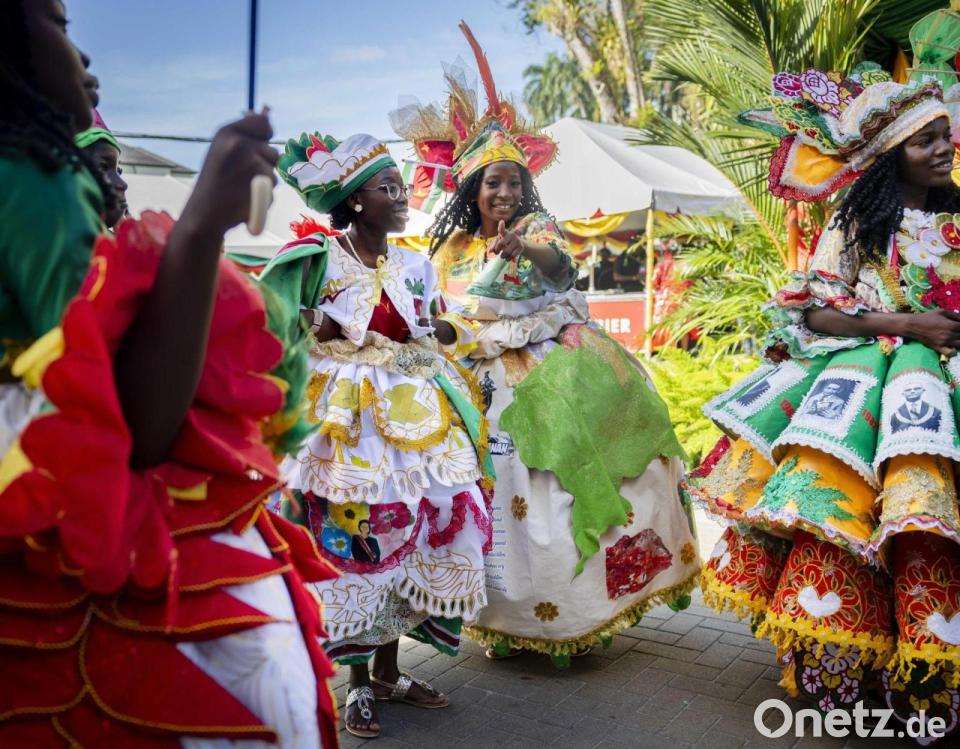 Bunt gekleidete Gäste feiern im Garten des Präsidentenpalastes von Suriname.