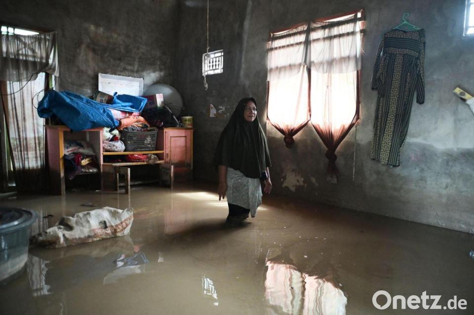 Eine Frau steht nach heftigen Monsun-Regenfällen in Indonesien in ihrem überfluteten Haus