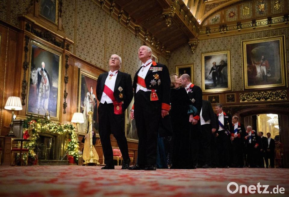 Bundespräsident Frank-Walter Steinmeier und König Charles III. gehen mit anderen Gästen zu einem Abendessen zu Ehren des Bundespräsidenten und seiner Frau in der St. George’s Hall von Schloss Windsor.