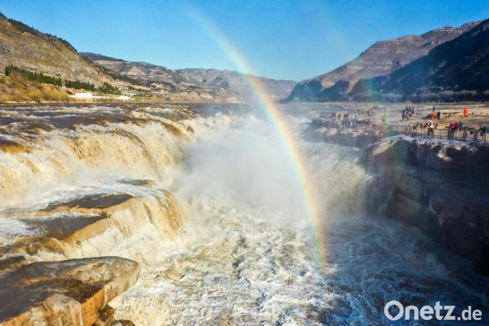 Ein doppelter Regenbogen leuchtet bunt über dem Hukou-Wasserfall im Kreis Jixian in der nordchinesischen Provinz Shanxi.