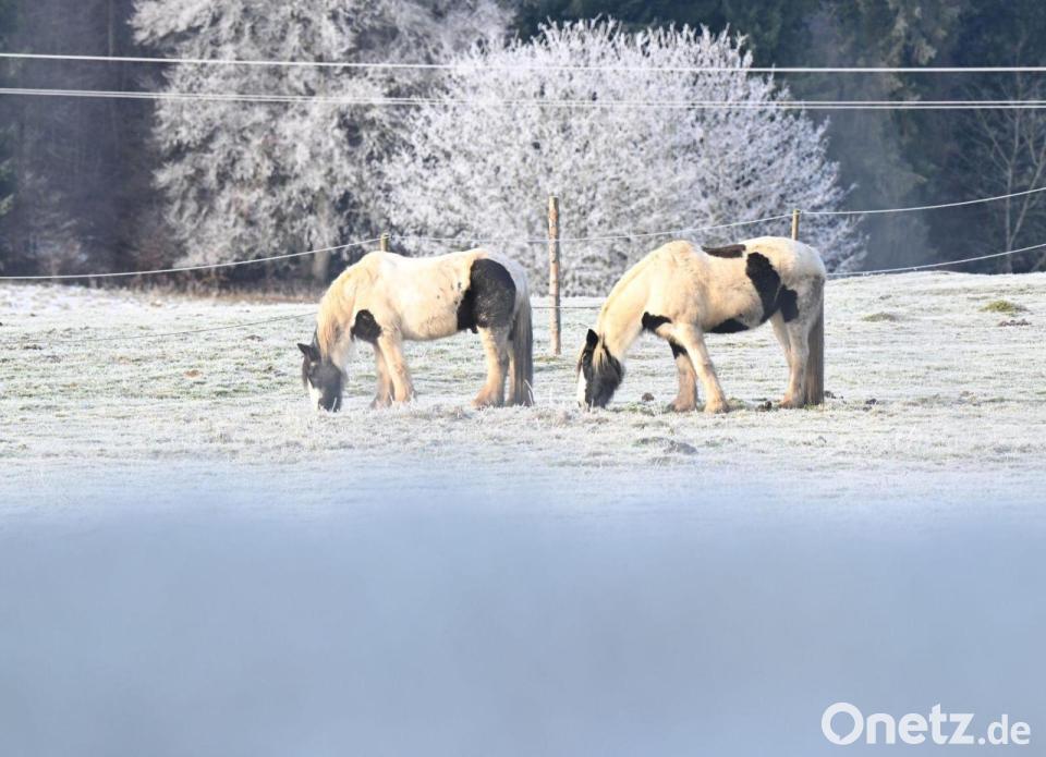 Eissalat: Zwei Pferde grasen auf einer mit Raureif bedeckten Wiese in Baden-Württemberg.
