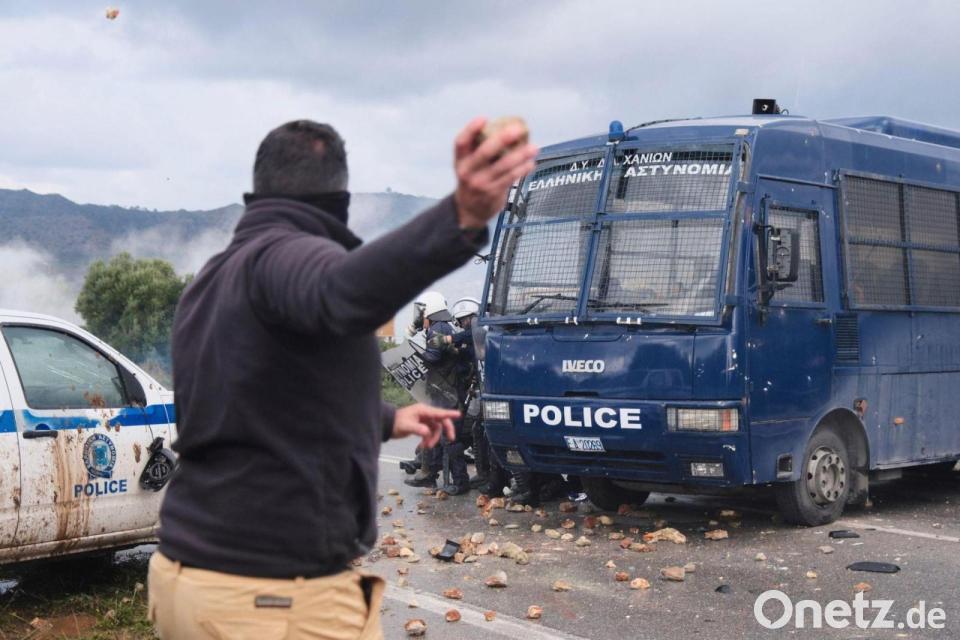 Ein Landwirt wirft bei Bauernprotesten in Griechenland Steine auf die Polizei.