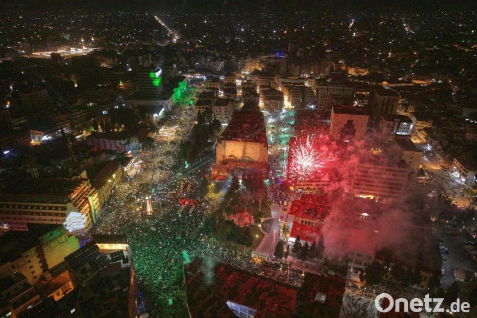 Feuerwerk erhellt den Himmel, während die Menschen den Clock Square in der syischen Stadt Homs anlässlich des ersten Jahrestags des Sturzes des Regimes von Bashar Assad füllen.