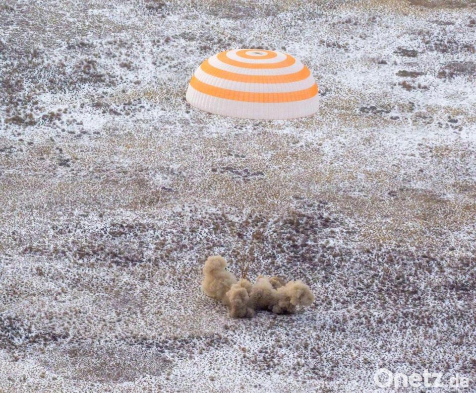 Das Sojus MS-27-Raumschiff ist bei der Landung in einem abgelegenen Gebiet in der Nähe der Stadt Zhezkazgan in Kasachstan zu sehen. An Bord sind der NASA-Astronaut Jonny Kim (Expedition 73) und die Roscosmos-Kosmonauten Sergei Ryzhikov und Alexei Zubritsky.