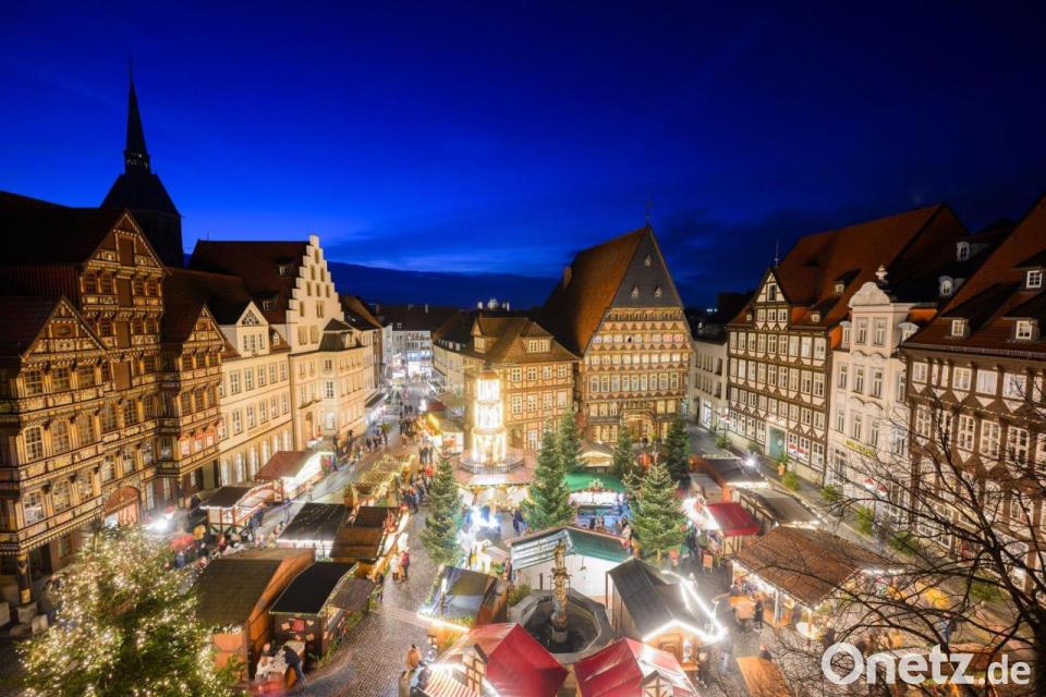 Lichter leuchten auf dem Hildesheimer Weihnachtsmarkt auf dem historischen Marktplatz mit dem Knochenhaueramtshaus.