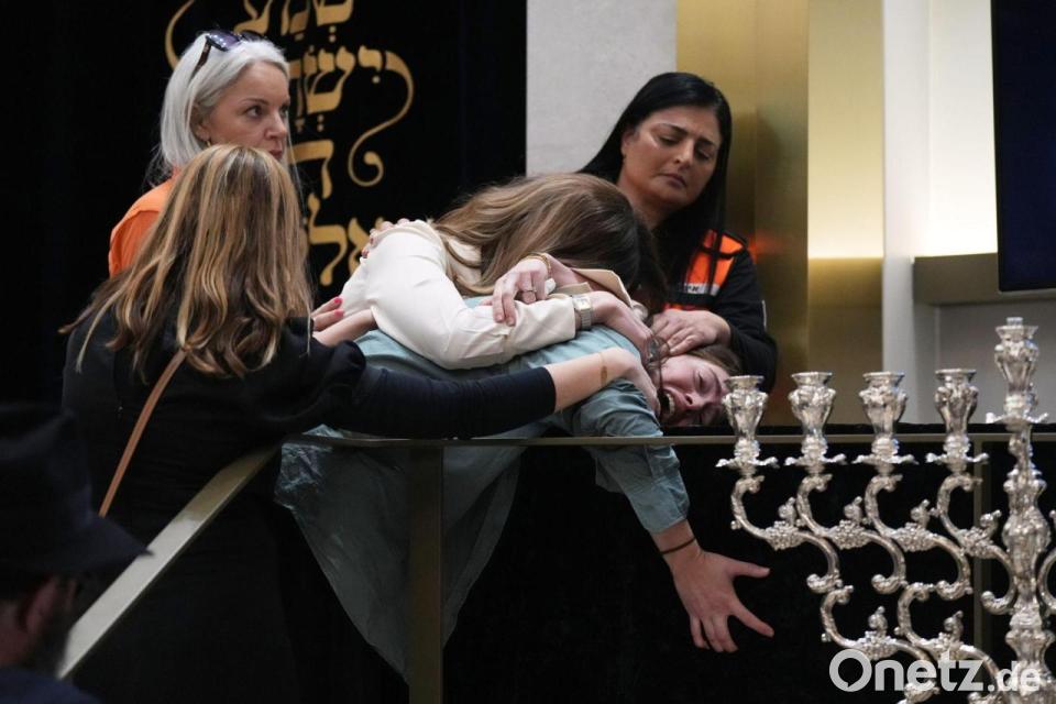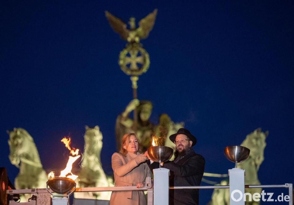 Bundestagspräsidentin Julia Klöckner (CDU) und Rabbiner Yehudi Teichtal entzünden am Brandenburger Tor während einer festlichen Zeremonie die Lichter am Chanukka-Leuchter mittels einer Fackel.