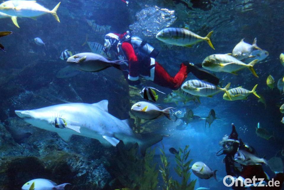 Taucher in Weihnachtsmannkostümen treten in der Sea Life Bangkok Ocean World in Bangkok auf.