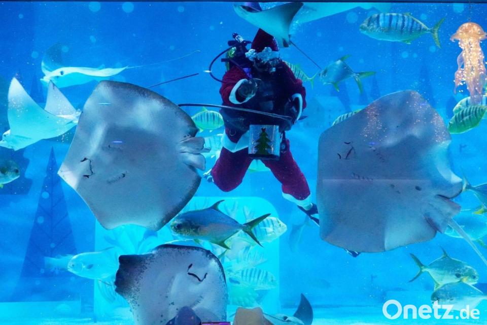 Ein Taucher im Weihnachtsmannkostüm füttert Fische im Coex Aquarium im südkoreanischen Seoul.
