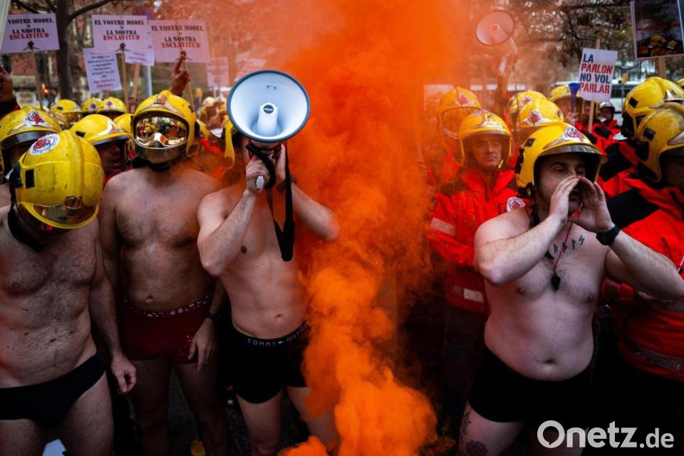 Spanische Feuerwehrleute demonstrieren in Badehosen in Barcelona.
