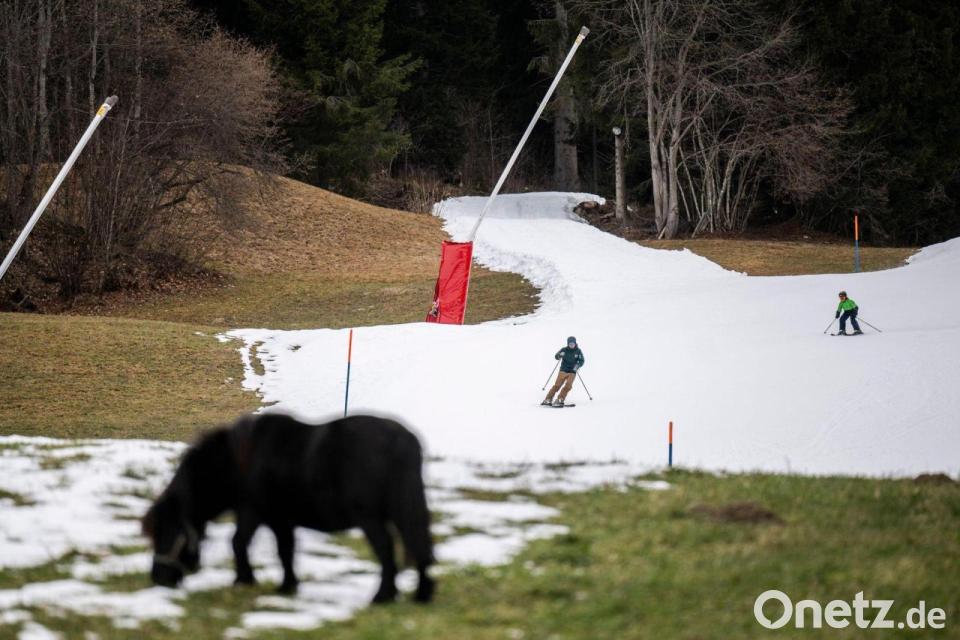 Kaum Schnee in der Schweiz: Zwergpony Ellie grast im Grünen vor einer Talabfahrt aus Kunstschnee in Graubünden .