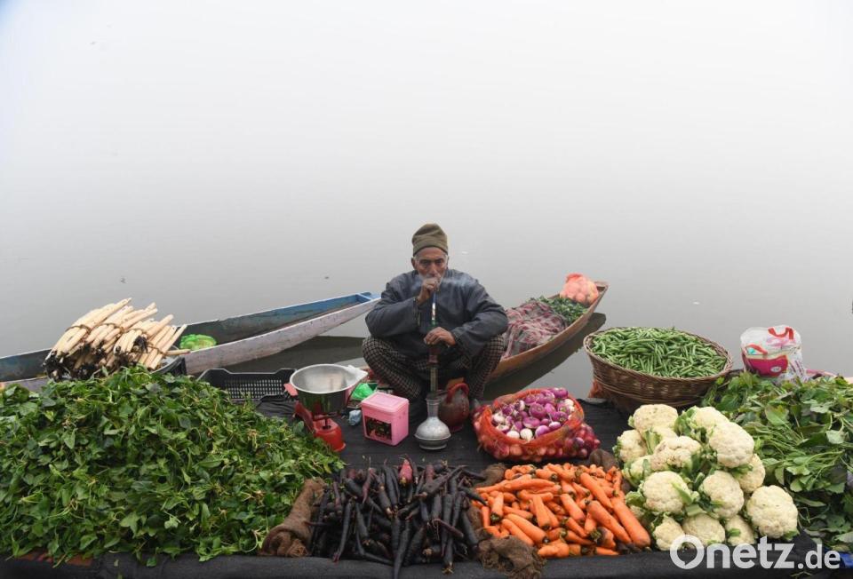 Ein Gemüsehändler raucht eine Wasserpfeife, während er an einem nebligen Tag am Ufer eines Sees im indischen Srinagar auf Kunden wartet.