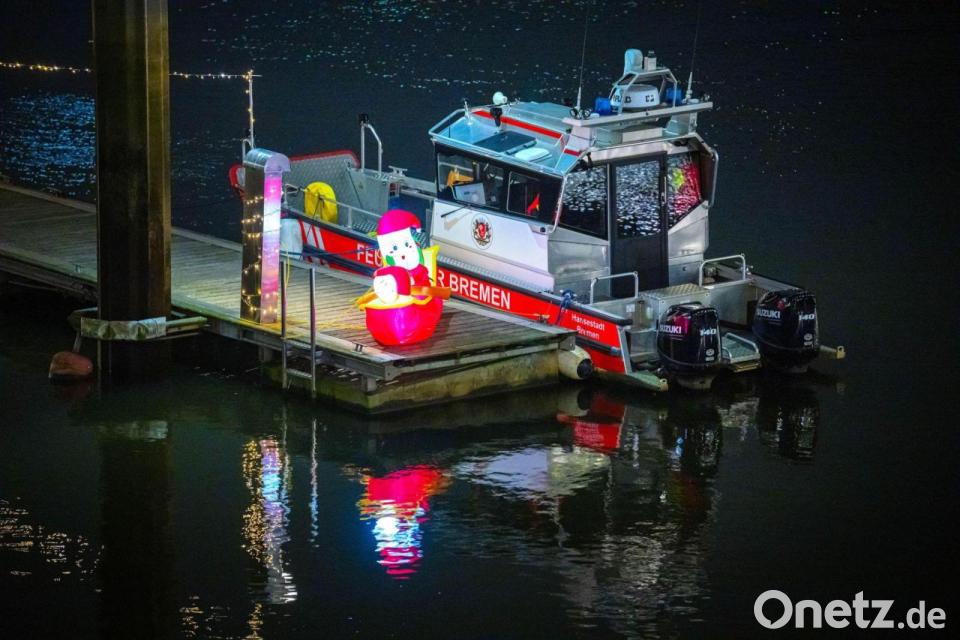 Ein leuchtender Weihnachtsmann steht neben einem Boot der Feuerwehr an der Weser in Bremen.