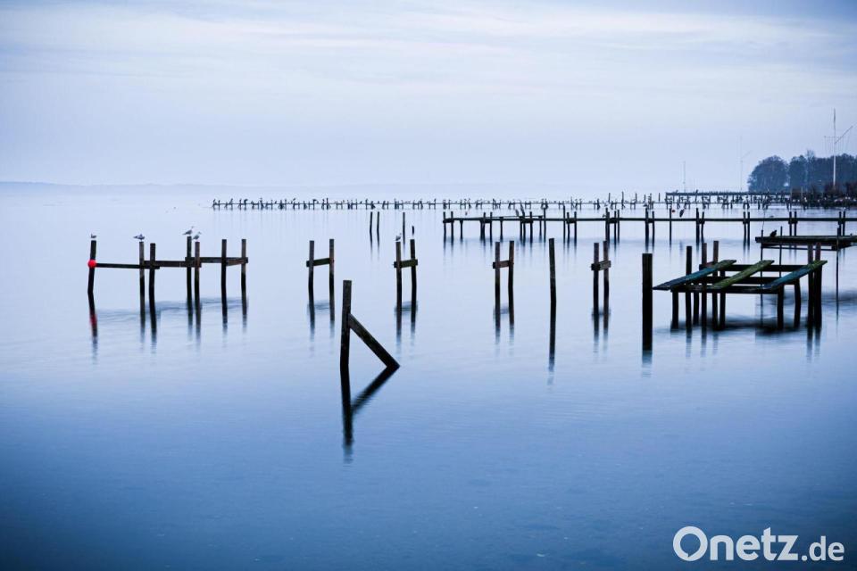 Wasserlandschaft: Pfähle einer abgebauten Steganlage ragen aus dem Steinhuder Meer.