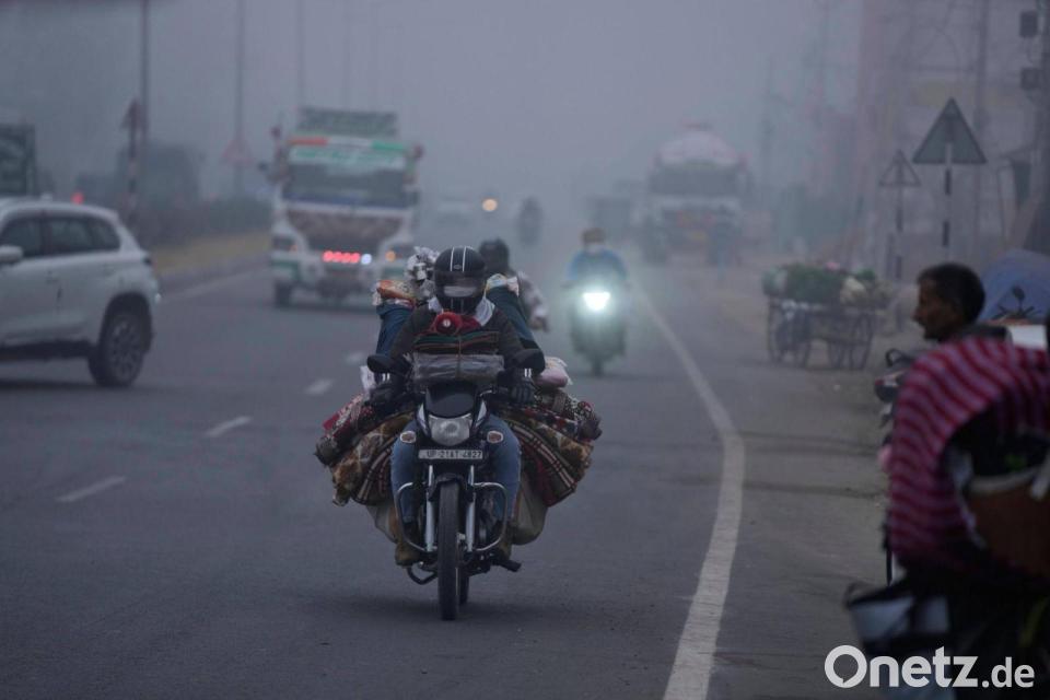 Trübe Sicht: Ein Händler transportiert seine Ware per Motorrad und fährt damit durch dichten Nebel im indischen Jammu.