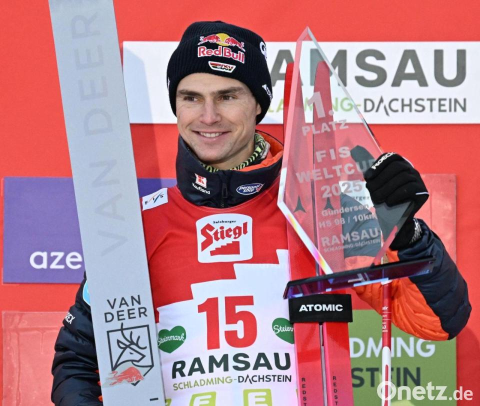 Sieger Vinzenz Geiger aus Deutschland steht beim Weltcup in Ramsau nach dem Gundersen Langlauf Wettbewerb über 10 km der Männer auf dem Podium - er bescherte den deutschen nordischen Kombinierern den ersten Saisonsieg