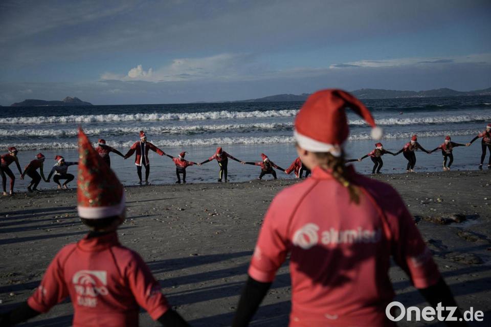 Mit Weihnachtsmannmützen verkleidete Menschen surfen während der „Papanoelada Surfera“ (Surfer-Nikolaus-Aktion) am Strand von Patos.