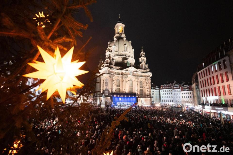 Zahlreiche Besucher verfolgen die traditionelle Christvesper auf dem Neumarkt vor der Frauenkirche in Dresden.