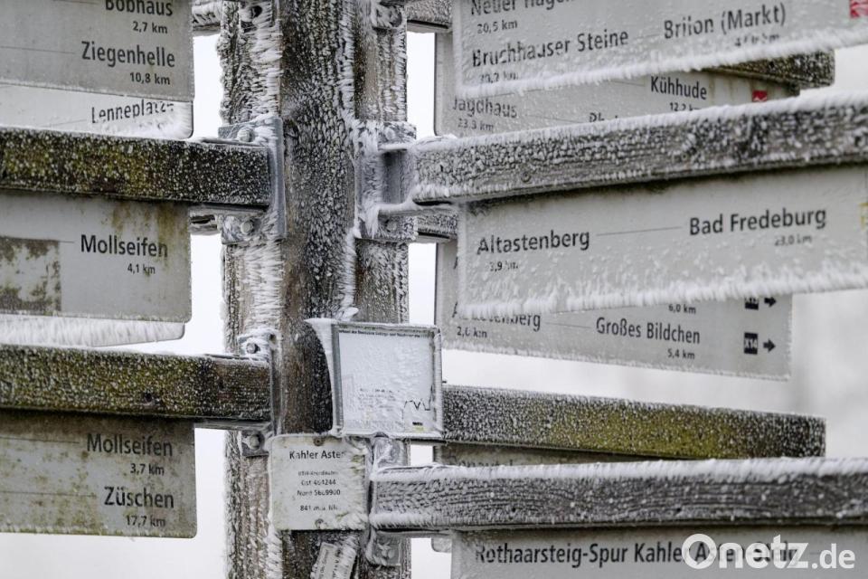 Schneekristalle haben sind auf einem Wander-Wegweiser auf dem Kahlen Asten gebildet.
