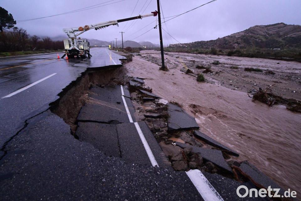 Ein Teil einer kalifornischen Straße wird von Fluten weggespült.