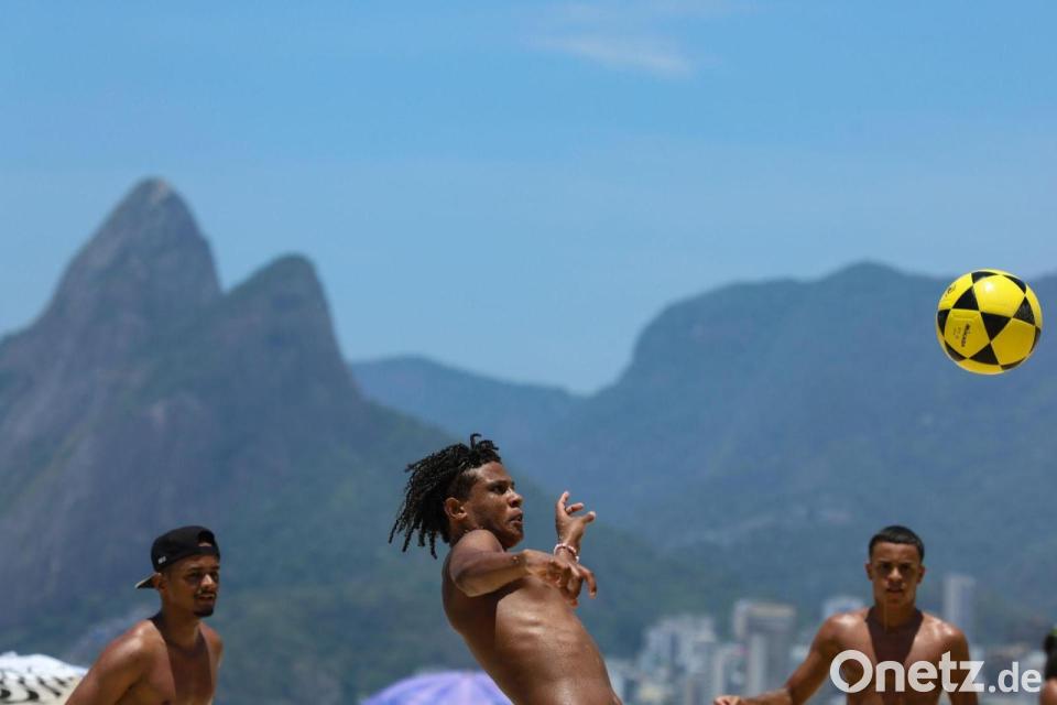 Brasilianer spielen bei 32 Grad nach den Weihnachtstagen Fußball am Strand in Rio de Janeiro.