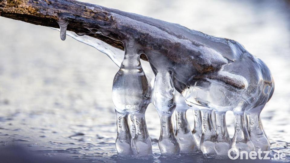 Kleine Eisstrukturen haben sich nach zwei sehr kalten Nächten am Ufer der Talsperre Spremberg gebildet.