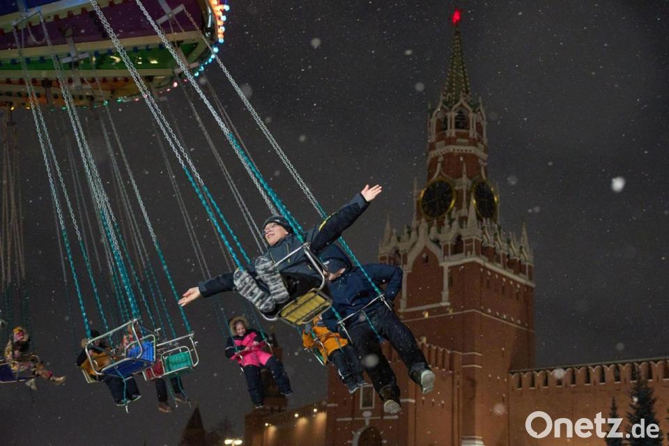 Karussell vor Kremlkulisse: Kinder vergnügen sich auf dem Weihnachtsmarkt am Roten Platz
